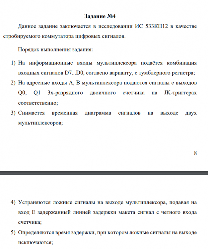 Задание №4 Данное задание заключается в исследовании ИC 533КП12 в качестве стробируемого коммутатора цифровых сигналов. Порядок выполнения задания: 1) На информационные входы мультиплексора подаётся комбинация входных сигналов D7...D0, согласно варианту, с тумблерного регистра; 2) На адресные входы А, B мультиплексора подаются сигналы с выходов Q0, Q1 3х-разрядного двоичного счетчика на JK-триггерах соответственно; 3) Снимается временная диаграмма сигналов на выходе двух мультиплексоров; 9 4) Устраняются ложные сигналы на выходе мультиплексора, подавая на вход Е задержанный линией задержки макета сигнал с четного входа счетчика; 5) Определяются время задержки, при котором ложные сигналы на выходе исключаются;