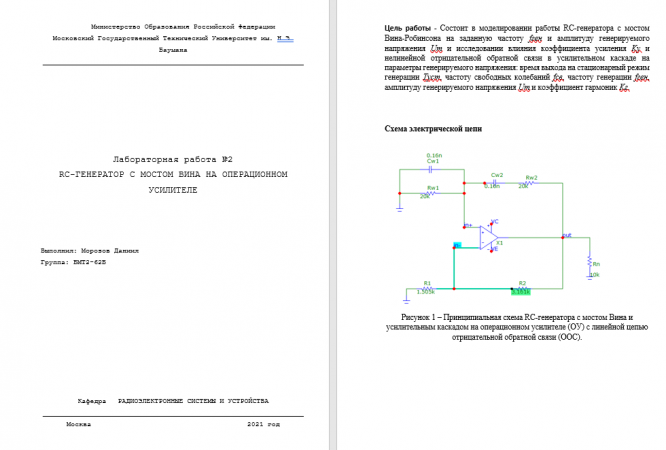 Для студентов МГТУ им. Н.Э.Баумана по предмету ЭлектроникаВариант 8 - ЛР №2 - RC-генератор с мостом Вина на ОУВариант 8 - ЛР №2 - RC-генератор с мостом Вина на ОУ
