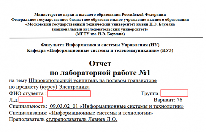 Для студентов МГТУ им. Н.Э.Баумана по предмету ЭлектроникаЛР№1 : Широкополосный усилитель на полевом транзисторе (Вариант 76) для ИУ3ЛР№1 : Широкополосный усилитель на полевом транзисторе (Вариант 76) для ИУ3