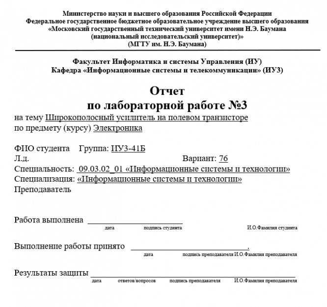 Для студентов МГТУ им. Н.Э.Баумана по предмету ЭлектроникаЛР№3 : Широкополосный усилитель на полевом транзисторе (Вариант 76) для ИУ3ЛР№3 : Широкополосный усилитель на полевом транзисторе (Вариант 76) для ИУ3