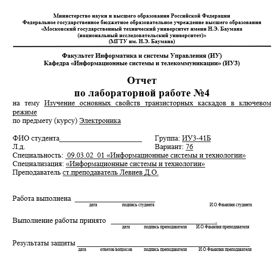 Главная » Учебные материалы » Электроника » Лабораторные работы » МГТУ им. Н.Э.Баумана » Несколько классов/семестров » Номер 4 » Вариант 76 » ЛР№4 : Изучение основных свойств транзисторных каскадов в ключевом режиме (Вариант 76) для ИУ3
