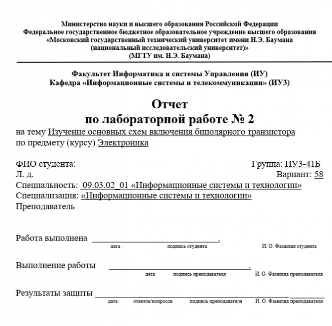 Для студентов МГТУ им. Н.Э.Баумана по предмету ЭлектроникаЛР№2 : Изучение основных схем включения биполярного транзистора (Вариант 58) для ИУ3ЛР№2 : Изучение основных схем включения биполярного транзистора (Вариант 58) для ИУ3