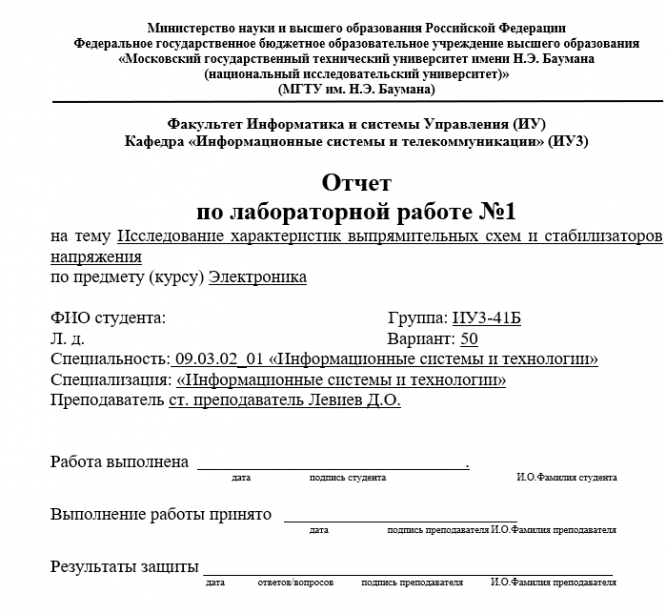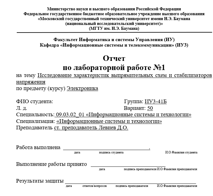 Для студентов МГТУ им. Н.Э.Баумана по предмету ЭлектроникаЛР№1 : Исследование характеристик выпрямительных схем и стабилизаторов напряжения (Вариант 50) для ИУ3ЛР№1 : Исследование характеристик выпрямительных схем и стабилизаторов напряжения (Вариант 50) для ИУ3
