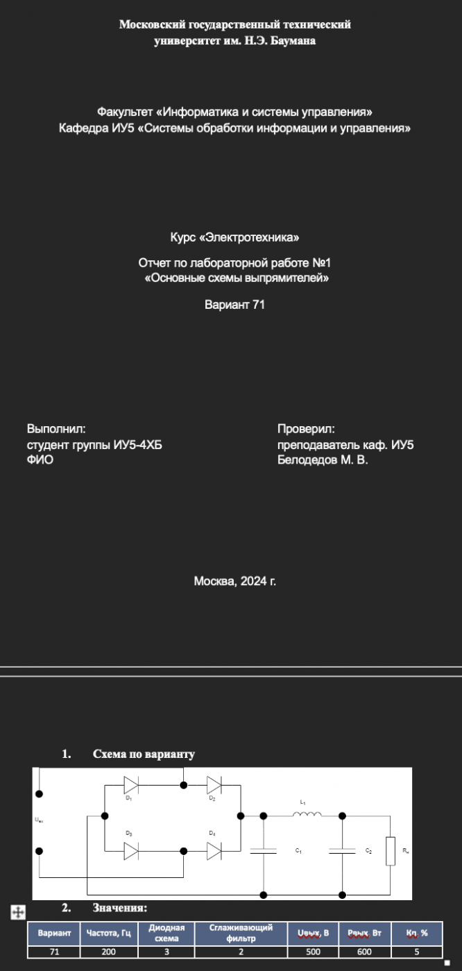 Лабораторная работа 1: Основные схемы выпрямителей. Схема Ларионова вариант 71