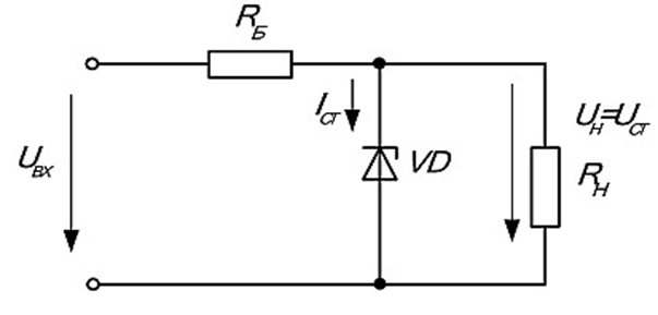 Дано: напряжение на нагрузке, сопротивление нагрузки и коридор изменения входного напряжения. Требуется определить в параметрическом стабилизаторе (рис. 4.1):