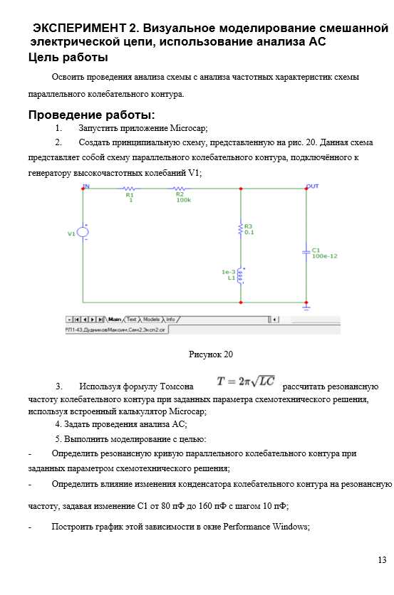 ЭКСПЕРИМЕНТ 1. Визуальное моделирование электрической цепи с нелинейным элементом и вывод результата решения в файл ЭКСПЕРИМЕНТ 2. Визуальное моделирование смешанной электрической цепи, использование анализа AC ЭКСПЕРИМЕНТ 3. Задание начальных условий во временном .