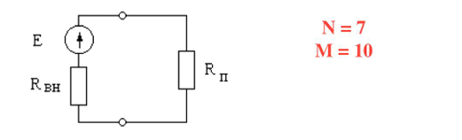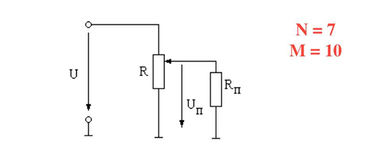 Задача 10 Определить напряжение Un на приемнике Rn = (10) Ом, если движок потенциометра установлен: а) в крайнем верхнем положении; б) в крайнем нижнем положении; в) в средней точке потенциометра. Сопротивление потенциометра R = (20М) Ом; U = (10N) В.