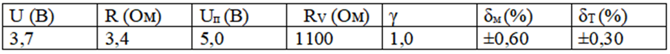 Оценить погрешность прямого однократного измерения напряжения U на сопротивлении R, выполненного вольтметром класса точности γ с верхним пределом измерения Uп, и имеющим сопротивление RV. Известно, что дополнительные погрешности показаний средства измерения из-за влияния магнитного поля и температуры не превышают соответственно δм и δТ допускаемой предельной погрешности.