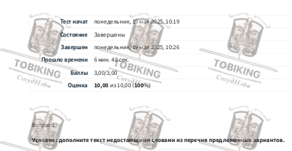 Вы можете использовать полученные ответы для подготовки к экзамену в учебном заведении и других целях, не нарушающих законодательство РФ и устав Вашего учебного заведения.