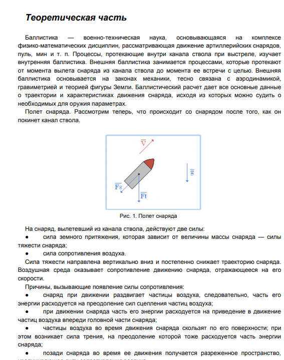 Баллистика — военно-техническая наука, основывающаяся на комплексе физико-математических дисциплин, рассматривающая движение артиллерийских снарядов, пуль, мин и т. п. Процессы, протекающие внутри канала ствола при выстреле, изучает внутренняя баллистика. Внешняя баллистика занимается процессами, которые протекают от момента вылета снаряда из канала ствола до момента ее встречи с целью. Внешняя баллистика основывается на законах механики, тесно связана с аэродинамикой, гравиметрией и теорией фигуры Земли. Баллистический расчет дает все основные данные о траектории и характеристиках движения снаряда, исходя из которых можно судить о необходимых для оружия параметрах. Полет снаряда. Рассмотрим теперь, что происходит со снарядом после того, как он покинет канал ствола. Рис. 1. Полет снаряда На снаряд, вылетевший из канала ствола, действуют две силы: ● сила земного притяжения, которая зависит от величины массы снаряда — силы тяжести снаряда; ● сила сопротивления воздуха. Сила тяжести направлена вертикально вниз и постепенно снижает траекторию снаряда. Воздушная среда оказывает сопротивление движению снаряда, отражающееся на его скорости. Причины, вызывающие появление силы сопротивления: ● снаряд при движении раздвигает частицы воздуха, следовательно, часть его энергии расходуется на преодоление сил сцепления частиц воздуха; ● при движении снаряда часть его энергии расходуется на приведение в движение частиц воздуха впереди головной части снаряда; ● частицы воздуха во время движения снаряда скользят по его поверхности; при этом возникает сила трения, на преодоление которой тоже расходуется часть энергии снаряда; ● позади снаряда во время ее движения получается разреженное пространство, увеличивающее силу сопротивления воздуха. Совокупность влияний на снаряд перечисленных факторов составляет силу сопротивления воздуха, действующую на снаряд во время полёта. Сила сопротивления воздуха зависит от скорости полета снаряда, от его формы, массы, калибра, поверхности, плотности воздуха. От увеличения плотности воздуха, калибра снаряда и ее скорости сопротивление воздуха возрастает, а чем глаже поверхность пули, тем меньше сила трения и сила сопротивления воздуха. Для нарезного оружия, имеющего сверхзвуковые скорости, у снарядов оптимальной формой является форма с удлиненной головной частью, а форма хвостовой части не имеет значения. При дозвуковой скорости целесообразно иметь удлиненную хвостовую часть, сужающуюся к концу. Рассмотрим теперь, как ведет себя снаряд при полете в воздушном пространстве. Введем два понятия — равнодействующую всех сил, образующих сил сопротивления воздуха, и точку ее приложения к пуле — центр сопротивления. Если бы пуля двигалась все время головной частью вперед, то сила сопротивления была бы направлена по оси пули от головной ее части к хвостовой. Такой случай на практике будет, когда пуля выстрелена вертикально вверх