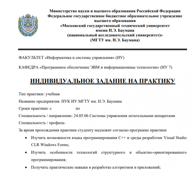 Название предприятия: НУК ИУ МГТУ им. Н.Э. Баумана Сроки практики: с по Специальность / направление: 24.05.06 Системы управления летательными аппаратами Специальность / профиль: За время прохождения практики студенту надлежит согласно программе практики • Изучить возможности языка программирования С++ и среды разработки Visual Studio CLR Windows Forms; • Изучить особенности технологий структурного и объектно-ориентированного программирования; • Получить практические навыки в разработке алгоритмов и приложений;