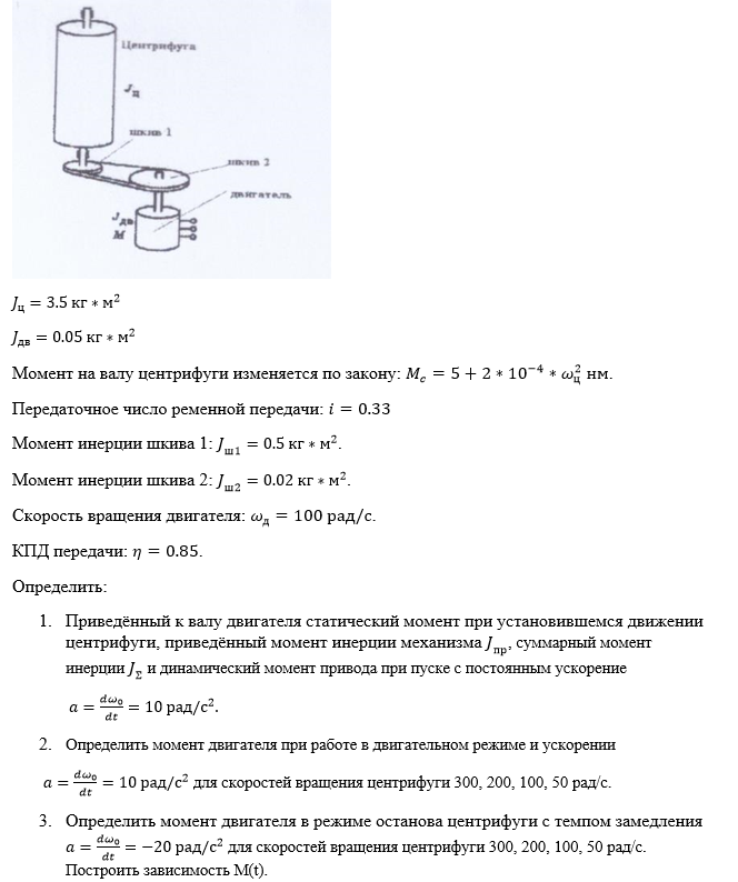 Приведённый к валу двигателя статический момент при установившемся движении центрифуги, приведённый момент инерции механизма , суммарный момент инерции и динамический момент привода при пуске с постоянным ускорение Определить момент двигателя при работе в двигательном режиме и ускорении для скоростей вращения центрифуги 300, 200, 100, 50 рад/с.