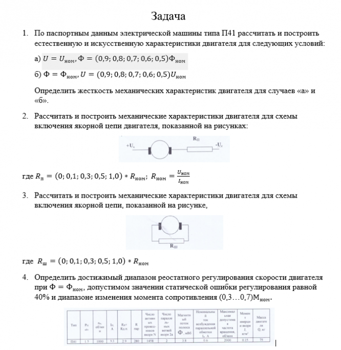 Для студентов СПбПУ Петра Великого по предмету ЭлектроприводПо паспортным данным электрической машины типа П41 рассчитать и построить естественную и искусственную характеристики двигателя для следующих условийПо паспортным данным электрической машины типа П41 рассчитать и построить естественную и искусственную характеристики двигателя для следующих условий