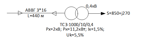 Потребитель с расчетной нагрузкой S=850+j270 кВА присоединен к трансформатору ТСЗ-1000/10/0,4 питающемуся от линии, выполненной кабелем АВВГ 3×16 мм². Потреблении электроэнергии за год в точке присоединения составило Wa=4520 тыс.кВт·ч, Wр=1160 тыс.кВар·ч. Определить абсолютные и относительные потери электроэнергии на передачу мощности в элементах электрической сети и расход энергии в линию.