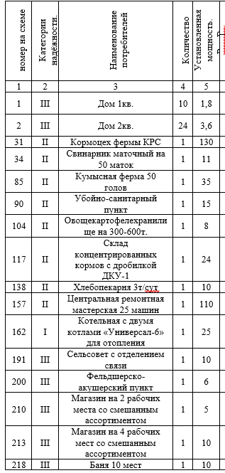 Всего в селе находится 48 объектов. Общественные потребители, такие как сельсовет с отделением связи, магазины, фельдшерско-акушерский пункт, баня, относятся к третьей категории надежности. Также как 10 одноквартирных домов 24 двухквартирных дома. Производственные потребители второй категории надежности, такие как кормоцех фермы КРС, свинарник маточник на 50 маток, кумысная ферма на 50 голов, убойно-санитарный пункт, овощехранилище на 300-600 т., склад концентрированных кормов с дробилкой ДКУ-1, хлебопекарня 3т/сут., центральная ремонтная мастерская 25 машин. Потребитель первой категории надежности - котельная с двумя котлами «Универсал-6» для отопления.