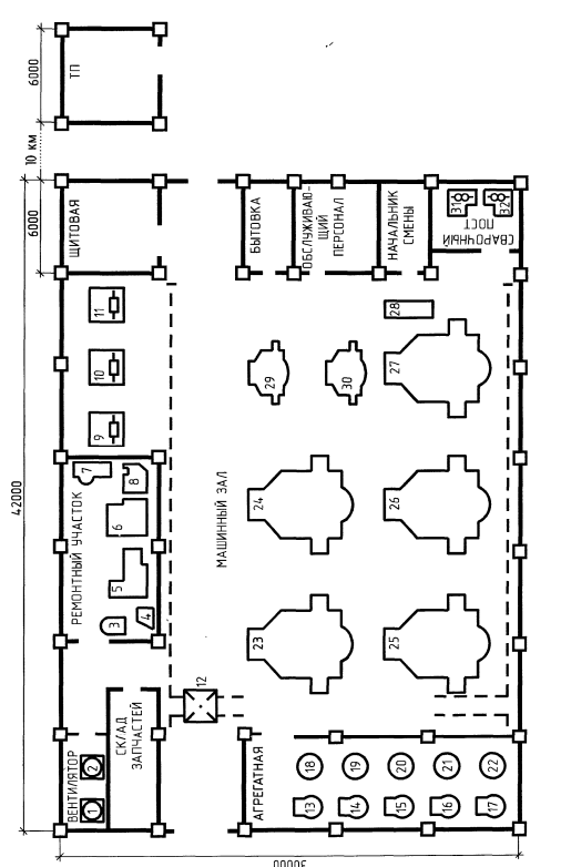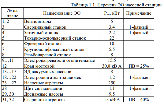 Насосная станция (НС) предназначена для мелиорации. Она содержит машинный зал, ремонтный участок, агрегатную, сварочный пост, служебные, бытовые и вспомогательные помещения. НС получает электроснабжение от государственной районной электростанции (ГРЭС) по воздушной ЛЭП-35. Расстояние от ГРЭС до собственной ТП — 5 км. Трансформаторная подстанция (ТП) находится вне помещения насосной станции на расстоянии 10 км. Потребители ЭЭ по надежности ЭСН относятся к 2 и 3 категории. Количество рабочих смен — 3. Основными потребителями являются 5 мощных автоматизированных насосных агрегата. Грунт в районе здания — глина с температурой +10 °С. Каркас здания и ТП сооружен из блоков-секций длиной 6 м каждый. Размеры здания НС А х В х Н= 42 х 30 х 7м. Все помещения, кроме машинного зала двухэтажные высотой 2,8 м. Перечень ЭО насосной станции представлен в таблице 1.1. Мощность электропотребления (Рэп) указана для одного электроприемника.