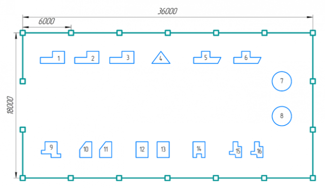 Каркас здания РМЦ смонтирован из блоков - секций длиной 6 метров каждый. Размеры цеха A*B*H= 36*18*6 метров.