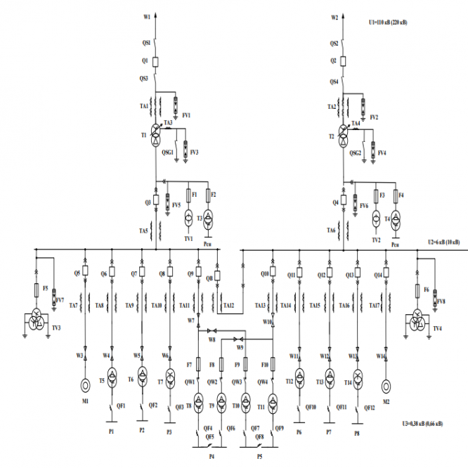 Задание № 4. По исходным данным произвести выбор следующего оборудования для системы электроснабжения предприятий (рис.1.14): трансформатор Т5; быстродействующий автоматический выключатель QF1, трансформа-тор Т1, выключатель Q3, кабель W4, трансформатор Т8, выключатель нагрузки QW1, предохранитель F7. Исходные данные: U1 = 110 кВ; U2 = 6 кВ; U3 = 0,66 кВ; P1 = 800 кВт; P2 = 200 кВт; P3 = 800 кВт; P4 = 400 кВт; P5 = 400 кВт; P6 = 180 кВт; P7 = 800 кВт; P8 = 190 кВт; Pсн = 300 кВт; Pм1 = 3100 кВт; Pм2 = 5000 кВт; Тmах = 4500 ч; cosφ = 0,9. Материал жилы кабеля – алюминий. Место прокладки кабеля – в воде. Для выбора силового трансформатора Т1 необходимо учесть всю мощность, протекающую через него, поэтому необходимо произвести расчёт и выбор двигателей М1 и М2.