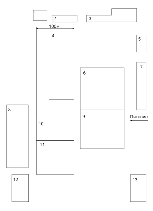 Генплан группы цехов представлен на рисунке 1, сведения об установленной мощности электроприёмников и другие данные в таблицах 1 и 2.