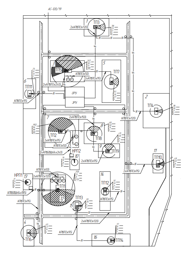Основные характеристики потребителей и системы электроснабжения группы цехов машиностроительного завода. 1. Суммарная установленная мощность электроприѐмников предприятия напряжением ниже 1000 В: 16828 кВт. 2. Суммарная установленная мощность электроприѐмников предприятия напряжением выше 1000 В: 5460 кВт. 3. Категория основных потребителей по надежности электроснабжения: потребители 1, 2 и 3 категорий. 4. Коэффициенты реактивной мощности: - заданный энергосистемой 0,27; - расчетный = 0,39. 5. Напряжение внешнего электроснабжения: 35 кВ. 6. Мощность КЗ на шинах 35 кВ энергосистемы: 1200 МВА. 7. Расстояние от предприятия до питающей подстанции энергосистемы 13 км; питающая воздушная линия выполнена проводом марки АС-120/19. 8. На ГПП установлены два трансформатора типа ТДН-10000/35/10. 9. Напряжение внутреннего электроснабжения предприятия: 10 кВ. 10. Для питания потребителей напряжением ниже 1000 В устанавливается 14 цеховых трансформаторных подстанций с трансформаторами типа ТМГ мощностью 250, 400, 630, 1000, 1250 кВ А. 11. Марка кабельных линий: АПвП-10 и АПвБбШп-0,4.