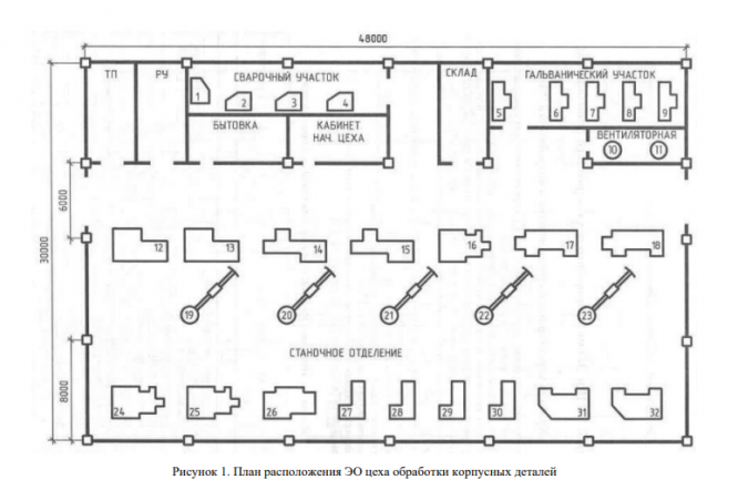 Цех обработки корпусных деталей (ЦОКД) предназначен для механической и антикоррозийной обработки изделий. Он содержит станочное отделение, гальванический и сварочные участки. Кроме того, имеются вспомогательные, бытовые и служебные помещения. Цех получает ЭСН от ГПП. Расстояние от ГПП до цеховой ТП – 0,8 км, а от энергосистемы до ГПП – 16 км. Низкое напряжение на ГПП – 6-10 кВ. Количество рабочих смен – 2. Потребители цеха относятся к 2 и 3 категории надежности ЭСН. Грунт в районе цеха – суглинок при температуре +5 ºС. Каркас здания смонтирован из блоков-секций длиной 8 м каждый. Размеры цеха А×В×Н=48×30×8 м. Все помещения, кроме станочного отделения, двухэтажные высотой 3,6 м