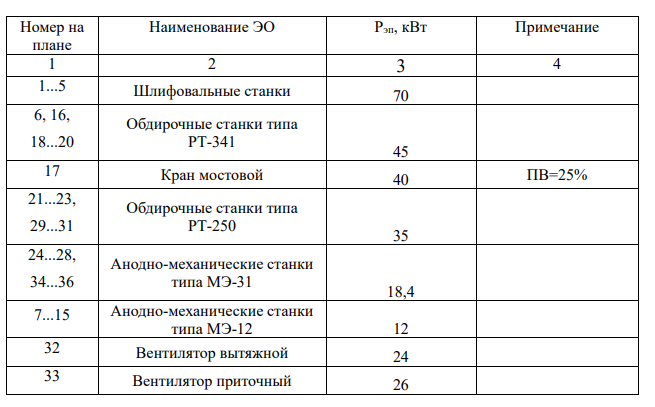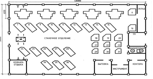 Механический цех тяжелого машиностроения (МЦТМ) предназначен для серийного производства изделий. Он является крупным вспомогательным цехом завода машиностроения и выполняет заказы основных цехов. Станочное отделение выполняет подготовительные операции (обдирку) изделий для дальнейшей обработки их на анодномеханических станках. Для этой цели установлено основное оборудование: обдирочные, шлифовальные, анод-но-механические станки и др. В цехе предусмотрены производственные, вспомогательные, служебные и бытовые помещения. МЦТМ получает ЭСН от ГПП или ПГВ завода. Расстояние от ГПП до цеховой ТП – 1,2 км. Напряжение 6 и 10 кВ. На ГПП подается ЭСН от ЭНС, расстояние – 8 км. Количество рабочих смен – 2. Потребители цеха относятся к 2 и 3 категории надежности ЭСН, работают в нормальной окружающей среде. Грунт в районе цеха – песок с температурой +20 °С. Каркас здания МЦТМ смонтирован из блоков-секций длиной 6 м каждый. Размеры цеха А × В × Н = 48 × 30 × 9 м. Вспомогательные, бытовые и служебные помещения двухэтажные высотой 4 м. Перечень оборудования цеха дан в таблице 3.5. Мощность электропотребления Pэп указана для одного электроприемника. Расположение основного оборудования показано на плане (рис. 3.5)