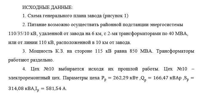 2. Питание возможно осуществить районной подстанции энергосистемы 110/35/10 кВ, удаленной от завода на 6 км, с 2-мя трансформаторами по 40 МВА, или от линии 110 кВ, расположенной в 10 км от завода.