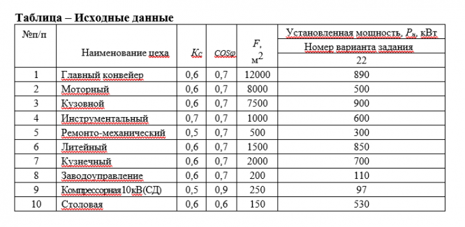 - Выполнить расчёт электрических нагрузок цехов предприятий заданной отрасли народного хозяйства по установленной мощности и коэффициенту спроса в соответствии со своим вариантом. Для одного цеха привести подробный расчёт с подставлением данных, а результаты расчётов по остальным цехам свести в таблицу.