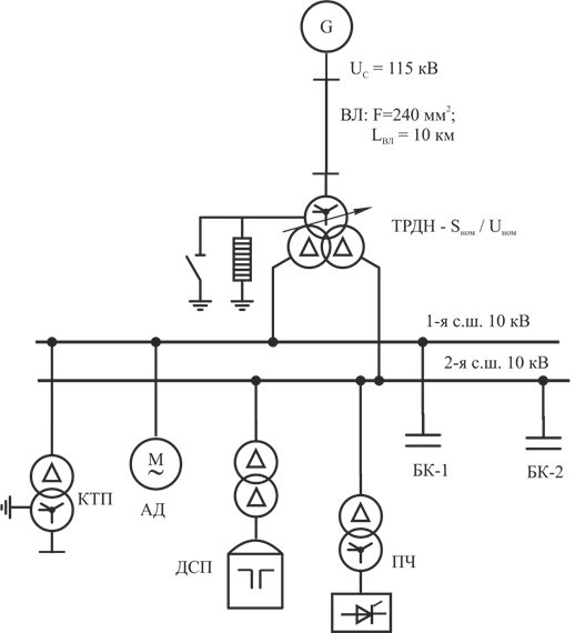 В приведенной на рисунке системе электроснабжения и заданных исходных данных определить установившееся отклонение напряжения на I-й секции шин 10 кВ ГПП