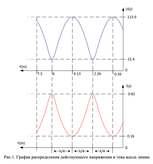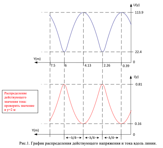 Построить график распределения действующих значений напряжения U и тока I в линии и в элементах согласующего устройства (трансформаторе, шлейфе) после согласования, считая, что действующее значение генератора U1 осталось неизменным.