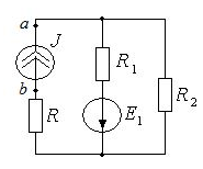 • 4. Дано: E1=100 В, R1=R2=10 Ом, R=5 Ом, J=5 А. Определить напряжение на источнике тока Uab.