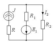 • 3. Дано: E1=100 В, R1=R2=10 Ом, R=5 Ом, J=5 А. Определить ток I2.