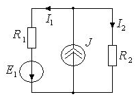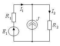 • 9. Известен ток I2=1 А, параметры элементов R1=1 Ом, R2=2 Ом, J=2 А. Определить I1 и E1.