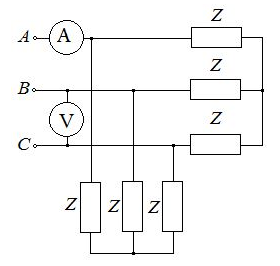 • 1. Симметричные применики подключены к трехфазному симметричному источнику. Показание вольтметра электромагнитной системы U=380 В, модуль комплексного сопротивления фазы симметричного применика Z=20 Ом. Определить показание электромагнитного амперметра.