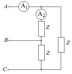 • 2. Амперметр A2 в симметричной трехфазной системе показывает 10 А. Определить показание А1.