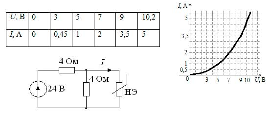 • 1. Вольтамперная характеристика нелинейного элемента задана таблично и графически. Определить ток в ветви с нелинейным элементом.