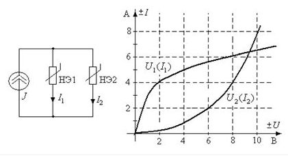 • 2. Два нелинейных элемента, вольтамперная характеристика которых задана на рисунке, соединены параллельно. Ток источника на входе J=10 А. Определить напряжение на нелинейных элементах.