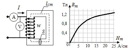 • 4. Катушка с магнитопроводом подключена к источнику синусоидального напряжения. Показание вольтметра 177,6 В, частота f=50 Гц. Средняя длина магнитопровода lст=50 см, площадь поперечного сечения S=100см², чисто витков обмотки w=200. Пренебрегая гистерезисом, рассеянием, активным сопротивлением обмотки, используя расчет по дуйствующим значениям, определить показание амперметра. Зависимость амплитуды индукции в магнитопроводе от амплитуды напряженности магнитного поля Bт(Нт) задана.