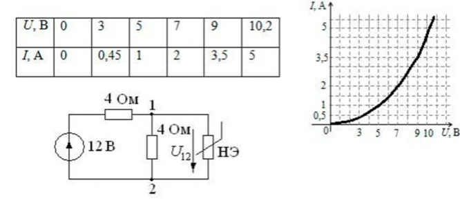 - Вольтамперная характеристика нелинейного элемента задана таблично и графически. Определить напряжение на нелинейном элементе U12.