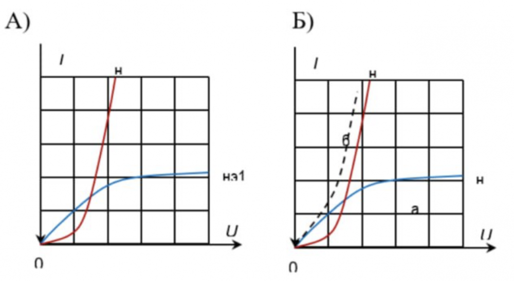 Два нелинейных элемента (НЭ) с известными ВАХ соединены последовательно. Какая из приведенных BAX (а или б) является характеристикой эквивалентного элемента последовательно соединенных НЭ?