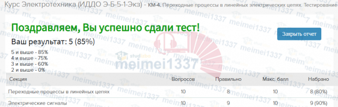 Курс Электротехника - КМ-4. Переходные процессы в линейных электрических цепях. Тестирование - 85%