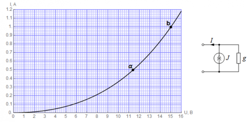 Нелинейный резистор в пределах рабочего участка a-b вольт-амперной характеристики заменён линейной схемой. Определить проводимость резистора, ответ записать мСм, округлить до сотых
