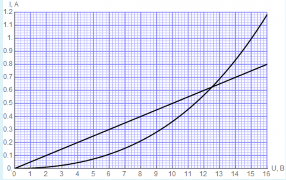 Пассивный двухполюсник, состоящий из двух параллельно соединённых резисторов с заданными вольт-амперными характеристиками, включен на постоянное напряжение 13 В. Определить статическое сопротивление двухполюсника, ответ записать в Ом, округлить до сотых