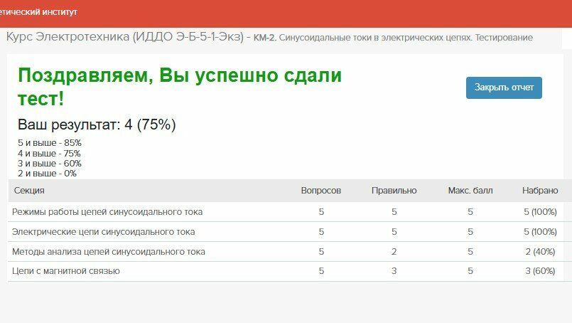 Ответы к тесту/контрольной: КМ-2. Синусоидальные токи в электрических цепях. Курс Электротехника
