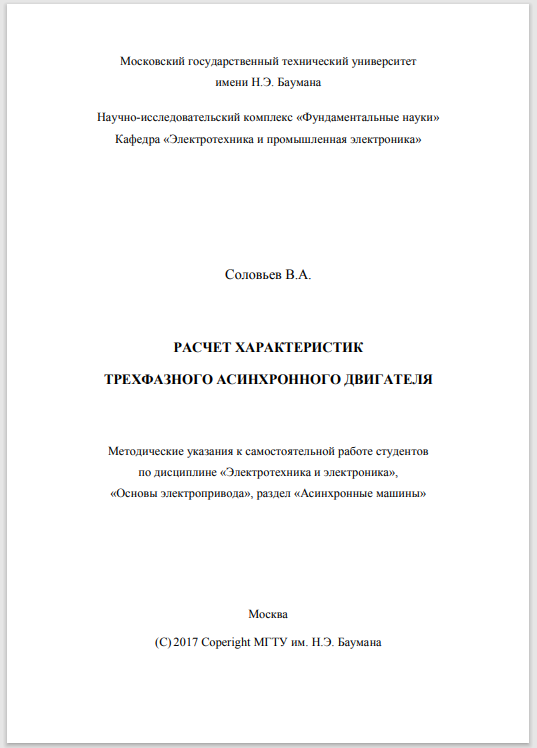 Расчет характеристик трехфазного асинхронного двигателя: методические указания к самостоятельной работе студентов по дисциплинам «Электротехника и электроника » , «Основы электропривода » / В.А. Соловьев. – М.: Изд-во МГТУ им. Н.Э. Баумана, 2014. – 44 с. : ил