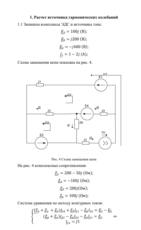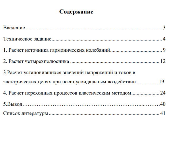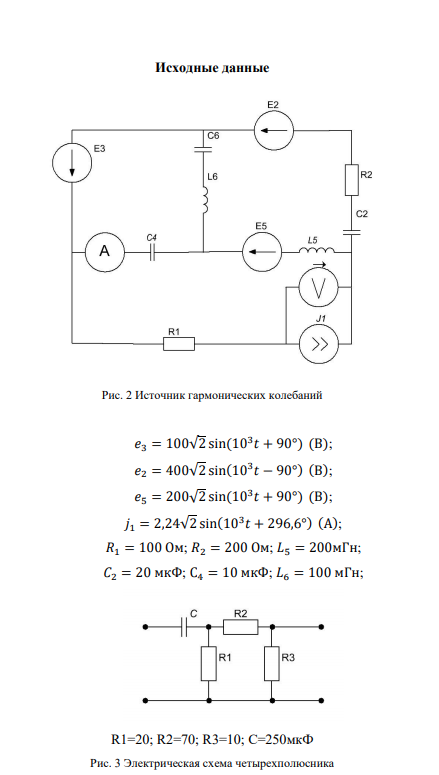Предметом курсовой работы является исследование электрической цепи, структурная схема которой показаны на рис. 1. Схемы активного двухполюсника —источника гармонических колебаний (ИГК), четырехполюсника и параметры их элементов выдаются преподавателем по вариантам в виде раздаточного материала. Рис. 1 Структурная схема электрической цепи1. Расчет источника гармонических колебаний (ИГК).1.1Определить все токи, показания вольтметра и амперметра электромагнитной системы.1.2Составить и рассчитать баланс мощностей.1.3Записать мгновенные значения тока и напряжения первичной обмотки трансформатора Т1 и построить их волновые диаграммы.1.4Представить исходную схему ИГК относительно первичной обмотки трансформатора эквивалентным источником напряжения. Определить его параметры (ЭДС и внутреннее сопротивление) и значение тока в первичной обмотке трансформатора. В качестве первичной обмотки трансформатора выбрать индуктивность в любой ветви, кроме ветви с идеальным источником тока.1.5Определить значения Mnq, Mnp, Lq, LpТ1из условия, что индуктивность первичной обмотки Lnизвестна, U1= 5 B, U2= 10 B. 5Коэффициент магнитной связи обмоток kследует выбрать самостоятельно в диапазоне: 0,5 0, т.е. в момент начала положительного импульса напряжения u4(t). Это условие будет выполнено при равенстве аргумента входного напряжения (t+ u3) = 2 k, где k= 0, 1, 2, 3. 63.1 Рассчитать законы изменения тока iвх(t)и напряжения uвых(t)частотным методом, представив напряжение uвх(t)= u4(t)в виде ряда Фурье до 5-й гармоники:uвх(t)= (4Um/ k) sinkt,где k–целое нечетное число.3.2 Построить графики uвх(t), uвх(t), iвх(t), uвых(t) в одном масштабе времени один под другим, где uвх(t), iвх(t),иuвых(t) -суммарные мгновенные значения. 3.3 Определить действующие значения uвх(t),iвх(t), uвых(t), полную (кажущуюся) мощность, а также активную мощность, потребляемую четырехполюсником, реактивную мощность,коэффициенты формы uвх(t),iвх(t), uвых(t).3.4 Заменить несинусоидальные кривые uвх(t), iвх(t) эквивалентными синусоидами и построить их графики.4. Расчет переходных процессов классическим методом.4.1 Определить и построить переходную и импульсную характеристики цепи четырехполюсника для входного тока и выходного напряжения.Показать связь этих характеристик с передаточным функциями, с АЧХ.4.2 Рассчитать и построить графики изменения тока iвхи напряжения uвыхчетырёхполюсника при подключении его к клеммам с напряжением u4(t)в момент времени, когда входное напряжение u3(t) = 0, du3/dt> 0, т.е. в момент начала положительного импульса напряжения u4(t). Это условие будет выполнено при равенстве аргумента входного напряжения (t+ u3) = 2 k, где k= 0, 1, 2, 3.а) на интервале времени [0, T], где T–период изменения напряжения u4(t);4.3 Рассчитать и построить графики напряжения на выходе uвых(t), а также токи на входе iвх(t)и в индуктивности в квазиустановившемся режиме 7на интервале времени [nT, (n+1)T]методом припасовывания. Сравнить результаты с полученным в п. 3.1.