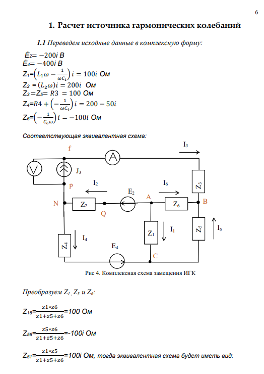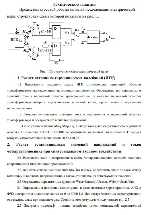 1. Расчет источника гармонических колебаний (ИГК) 1.1 Представить исходную схему ИГК относительно первичной обмотки трансформатора эквивалентным источником напряжения. Определить его параметры и значение тока в первичной обмотке трансформатора. В качестве первичной обмотки трансформатора выбрать индуктивность в любой ветви, кроме ветви с идеальным источником тока. 1.2 Записать мгновенные значения тока и напряжения в первичной обмотке трансформатора и построить их волновые диаграммы. 1.3 Определить значения Mnq, Mnp, Lq, Lp из условия, что индуктивность первичной обмотки Ln известна, U1=5В, U2=10В. Коэффициент магнитной связи обмоток k следует выбрать самостоятельно в диапазоне: 0,5