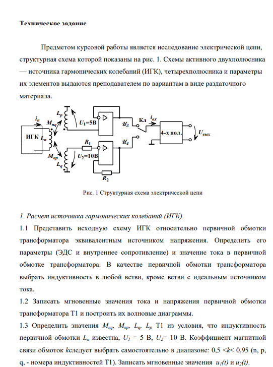 Предметом курсовой работы является исследование электрической цепи, структурная схема которой показаны на рис. 1. Схемы активного двухполюсника — источника гармонических колебаний (ИГК), четырехполюсника и параметры их элементов выдаются преподавателем по вариантам в виде раздаточного материала.