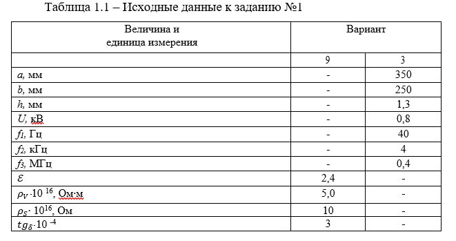 По образцу прямоугольной формы из диэлектрического материала размерами a×b и толщиной h приложено постоянное напряжение. Напряжение подводится к граням ab, покрытым слоями металла.Известны удельное объемное сопротивление ρ, удельное поверхностное сопротивление ρS, диэлектрическая проницаемость ε, тангенс угла диэлектрических потерь tg δ.