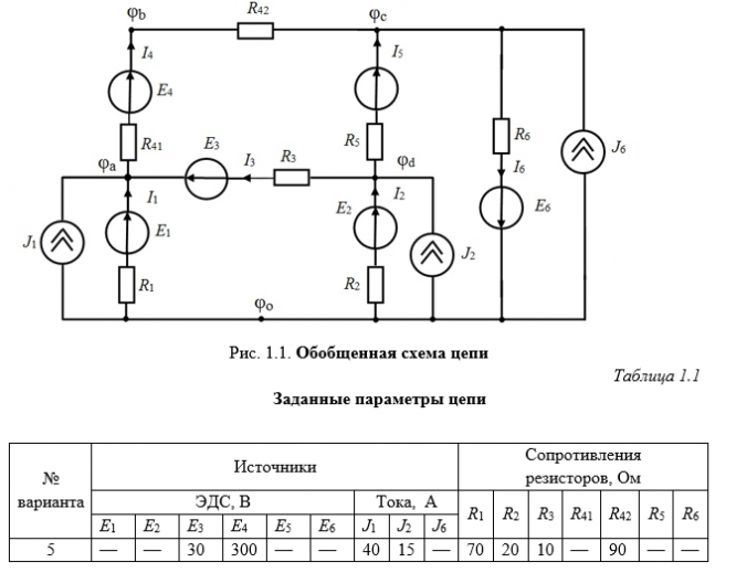 1. По заданной обобщенной схеме (рис.1.1) изобразить схему цепи, соответствую­щую вашему варианту (см. табл. 1.1), исключив источники ЭДС и источники тока, отсутствующие в таблице 1.1. После этого в цепи должны остаться два источника ЭДС и два источника тока.